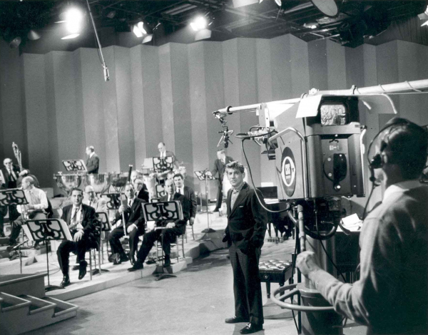 Leonard Bernstein with members of the Philharmonic rehearsing for a television broadcast, ca. 1958. Photo by Bert Bial, courtesy of the New York Philharmonic Shelby White & Leon Levy Digital Archives.