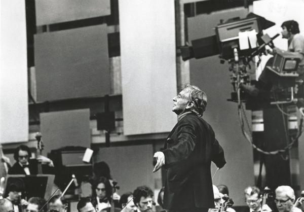 Leonard Bernstein with members of the Philharmonic rehearsing for a television broadcast, ca. 1958. Photo by Bert Bial, courtesy of the New York Philharmonic Shelby White & Leon Levy Digital Archives.